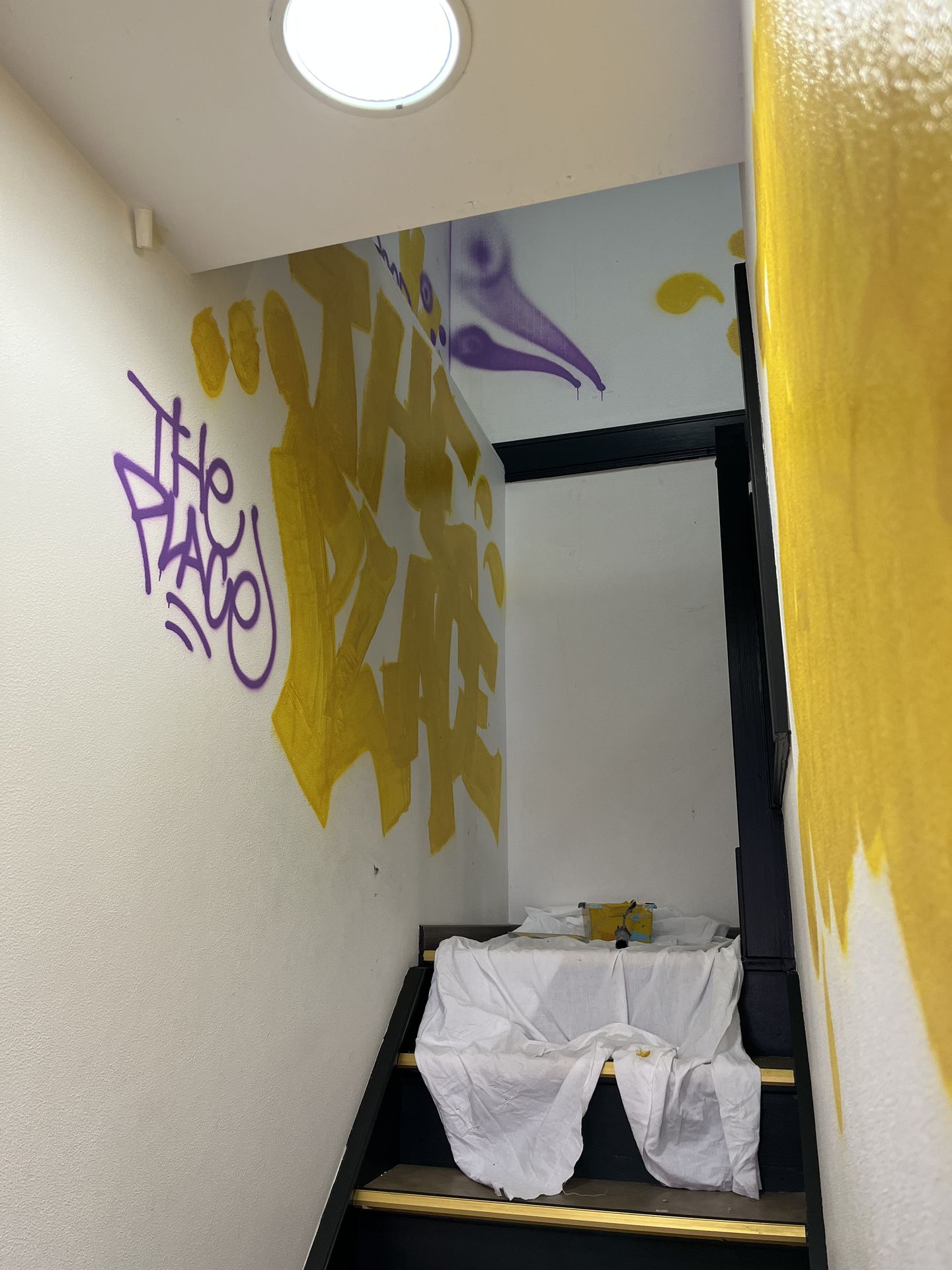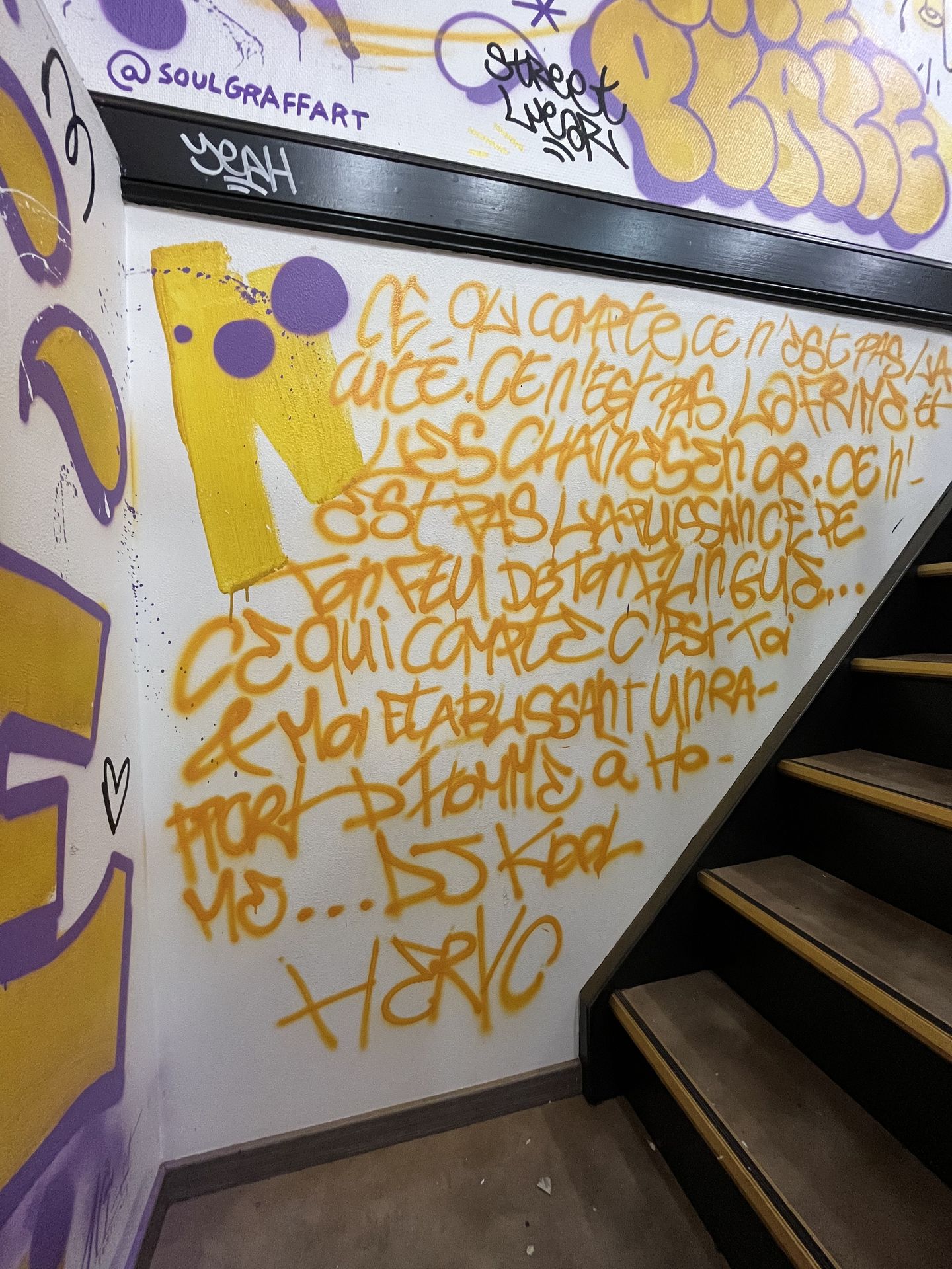 Avant même d’arriver en haut, tu passes par notre escalier graffé par des artistes de 10ème art. Violet, jaune, noir, le style The Place.