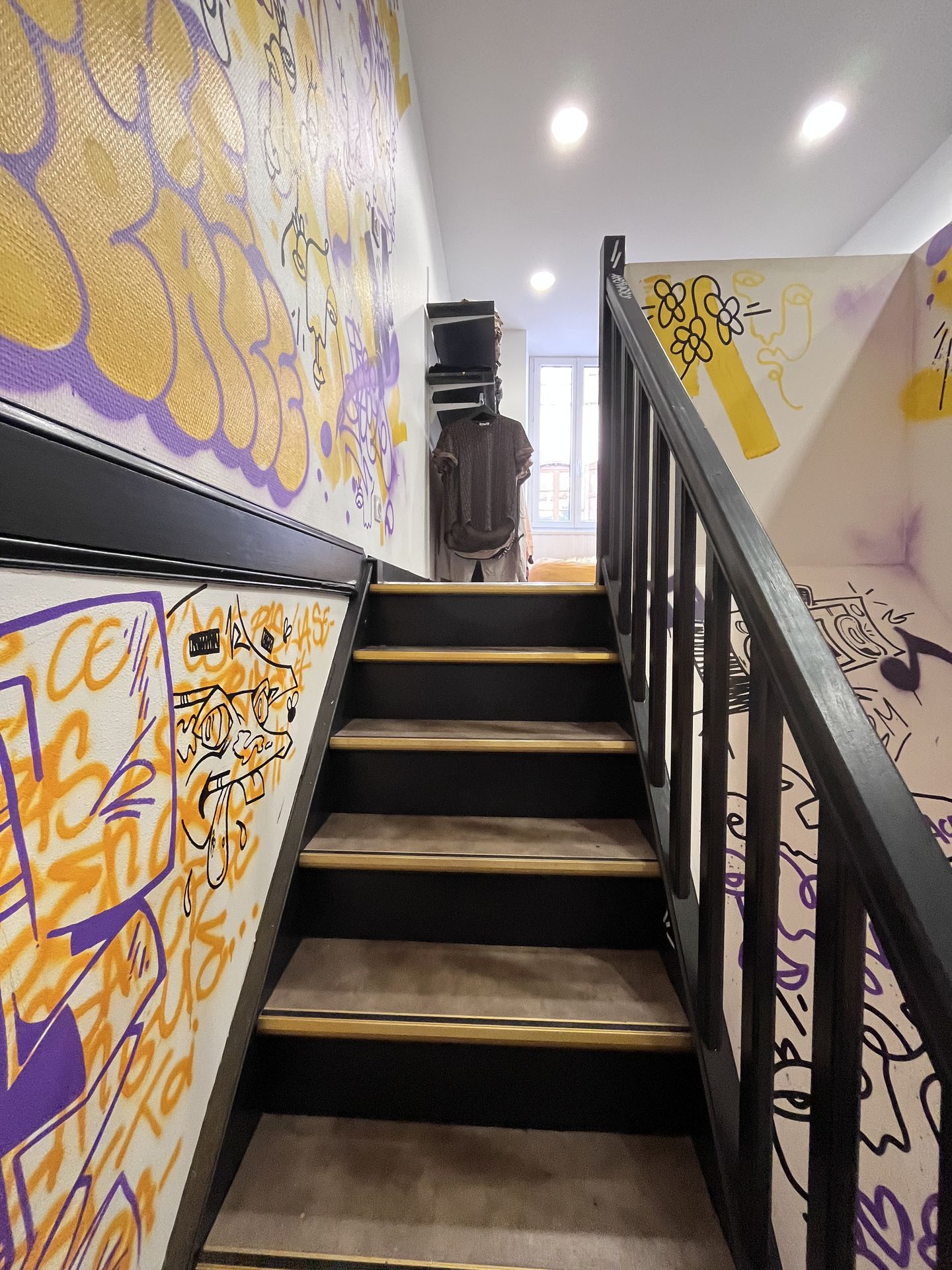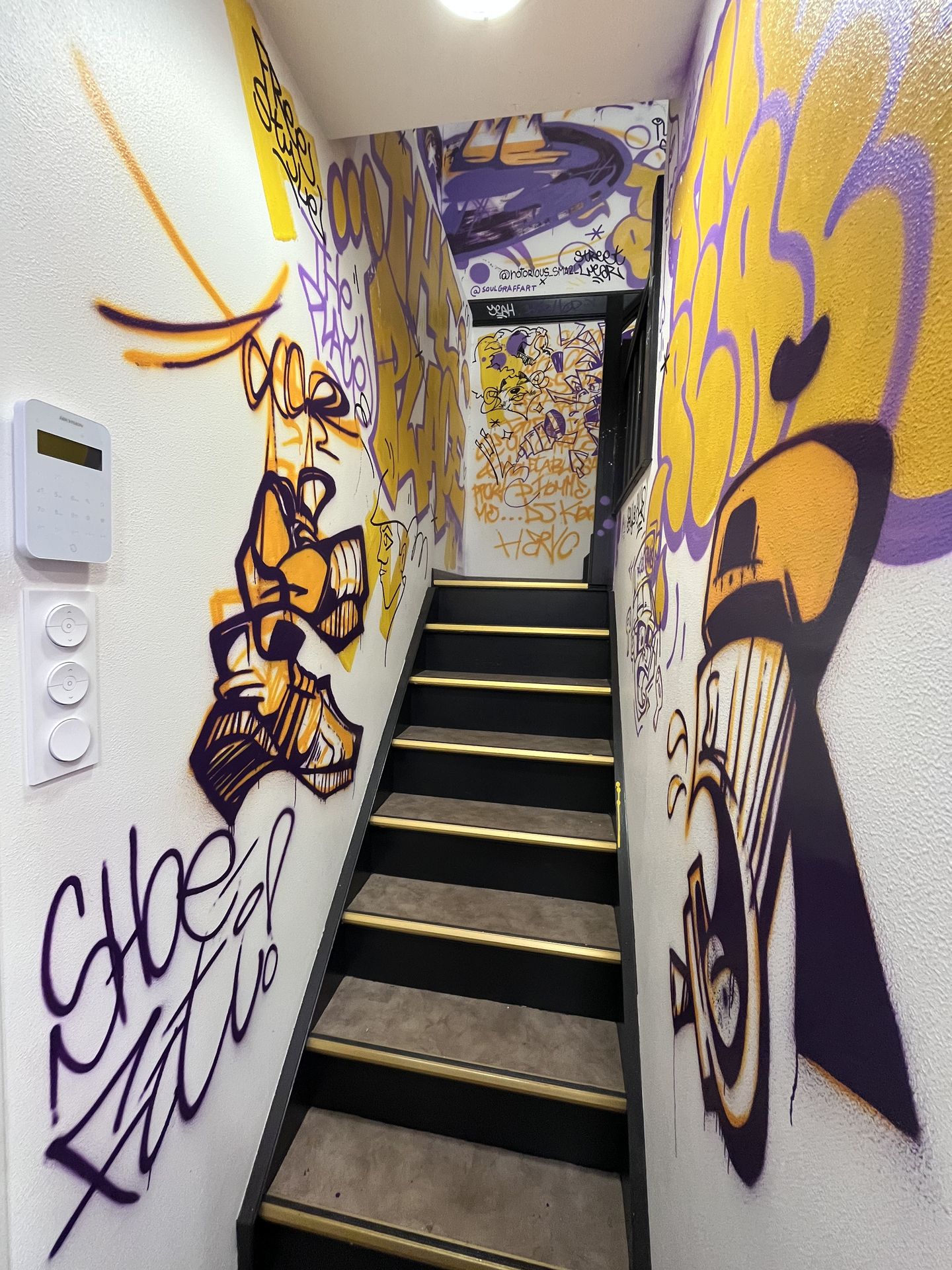 Avant même d’arriver en haut, tu passes par notre escalier graffé par des artistes de 10ème art. Violet, jaune, noir, le style The Place.